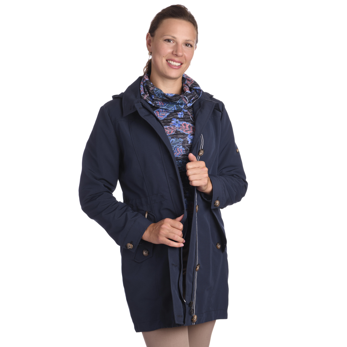 - dlouhá přechodová tmavě modrá bunda s odepínací kapucou