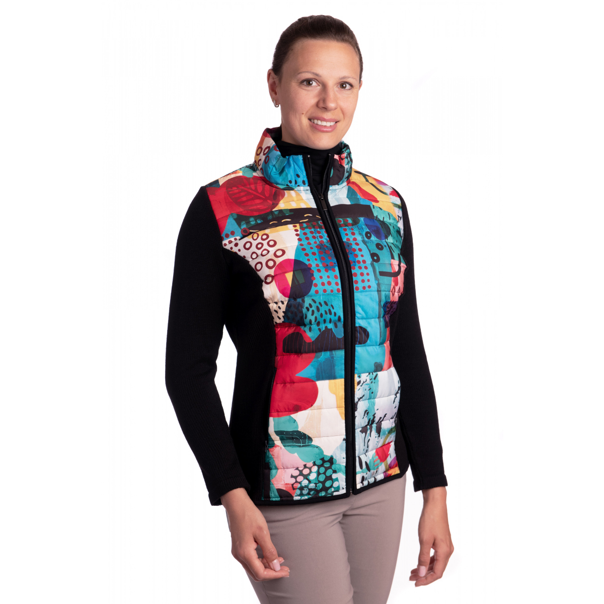 - přechodová bunda se stojáčkem s nápadným barevným abstraktním vzorem