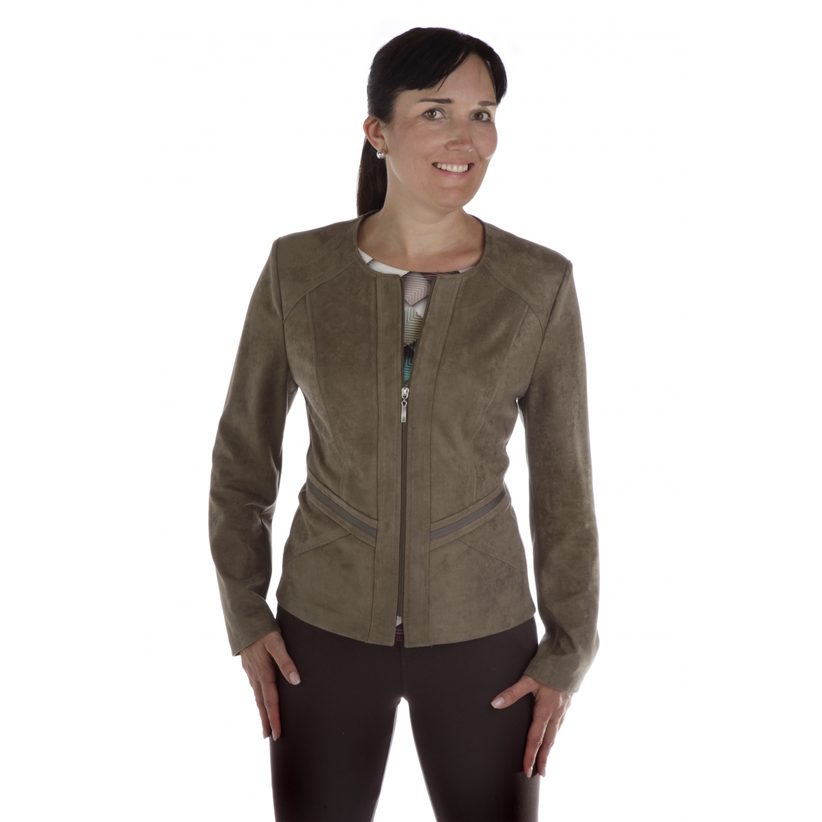 - praktický semišový kabátek se zapínáním na zip v tmavě zelené barvě