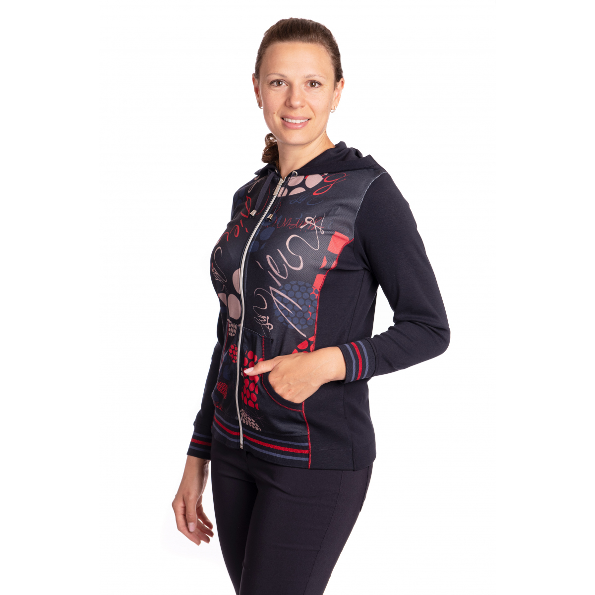 - černý bavlněný kabátek s barevným geometrickým vzorem na přední části