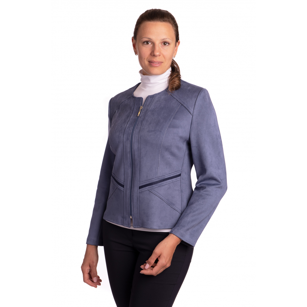 - praktický semišový kabátek se zapínáním na zip v barvě modrá jeans