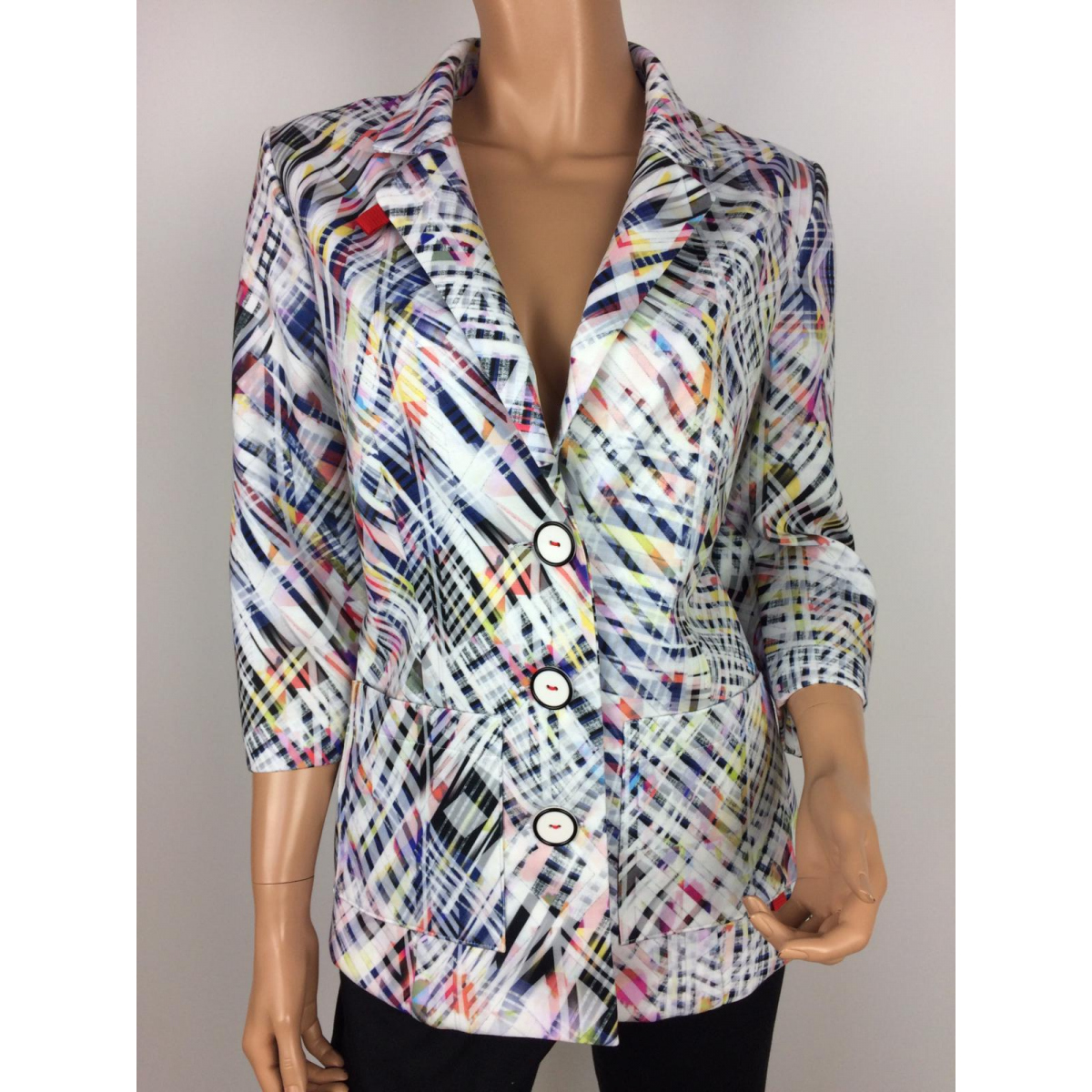 - zajímavé dámské delší sako s klopou a motivem barevných proužků z lehkého, elastického materiálu