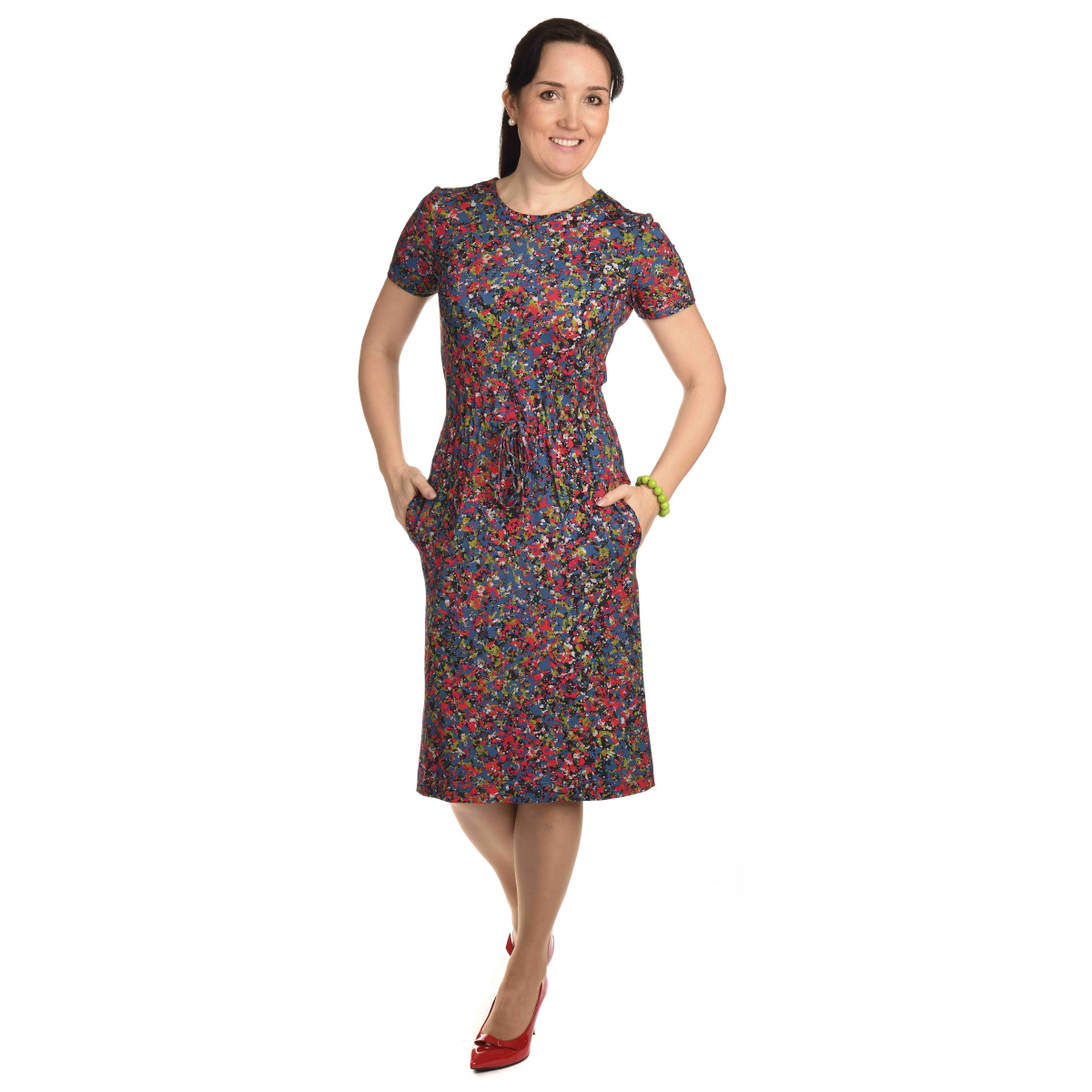 - šaty s drobnými červenomodrými kvítky