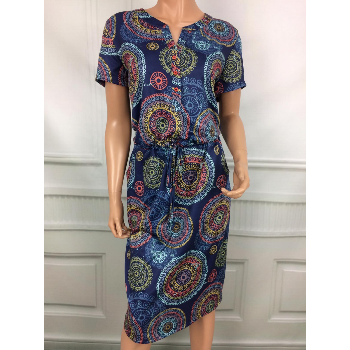 - šaty s barevným geometrickým vzorem na tmavomodrém podkladu