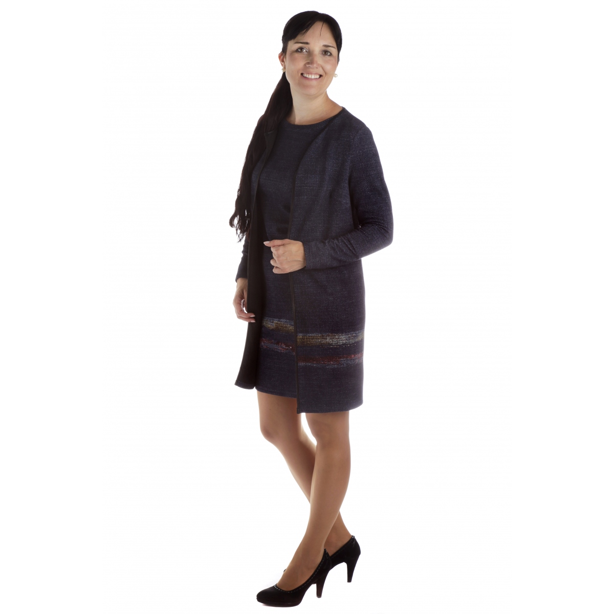 - tmavomodré šaty s béžovo okrovými pruhy ve spodní části
