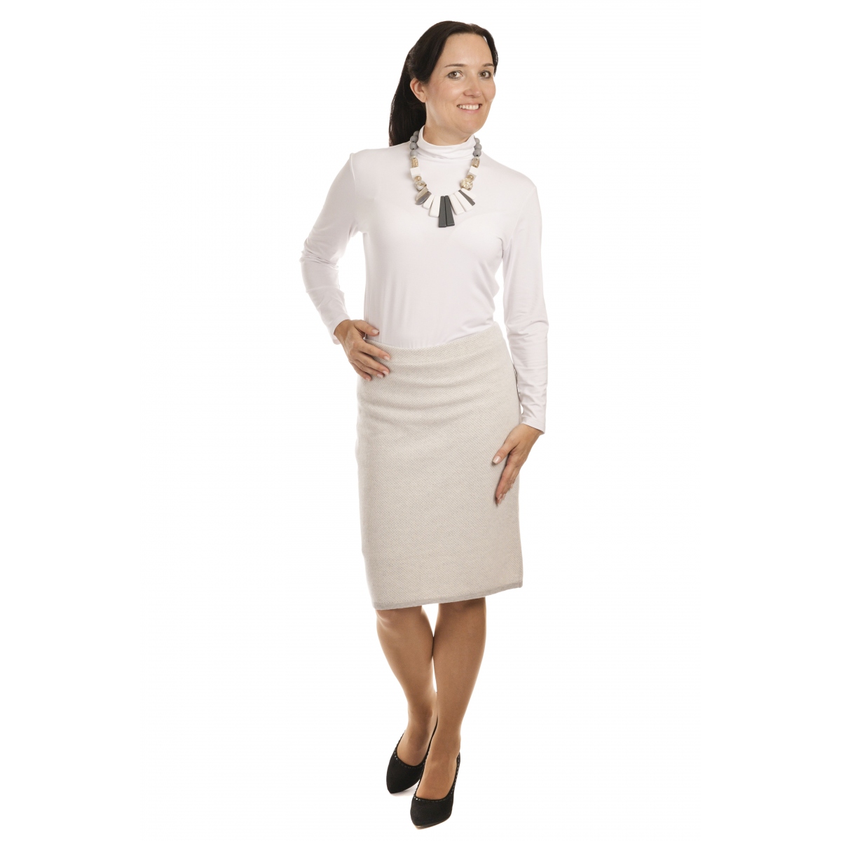 - úpletová šedobílá sukně s jemným vzorkem