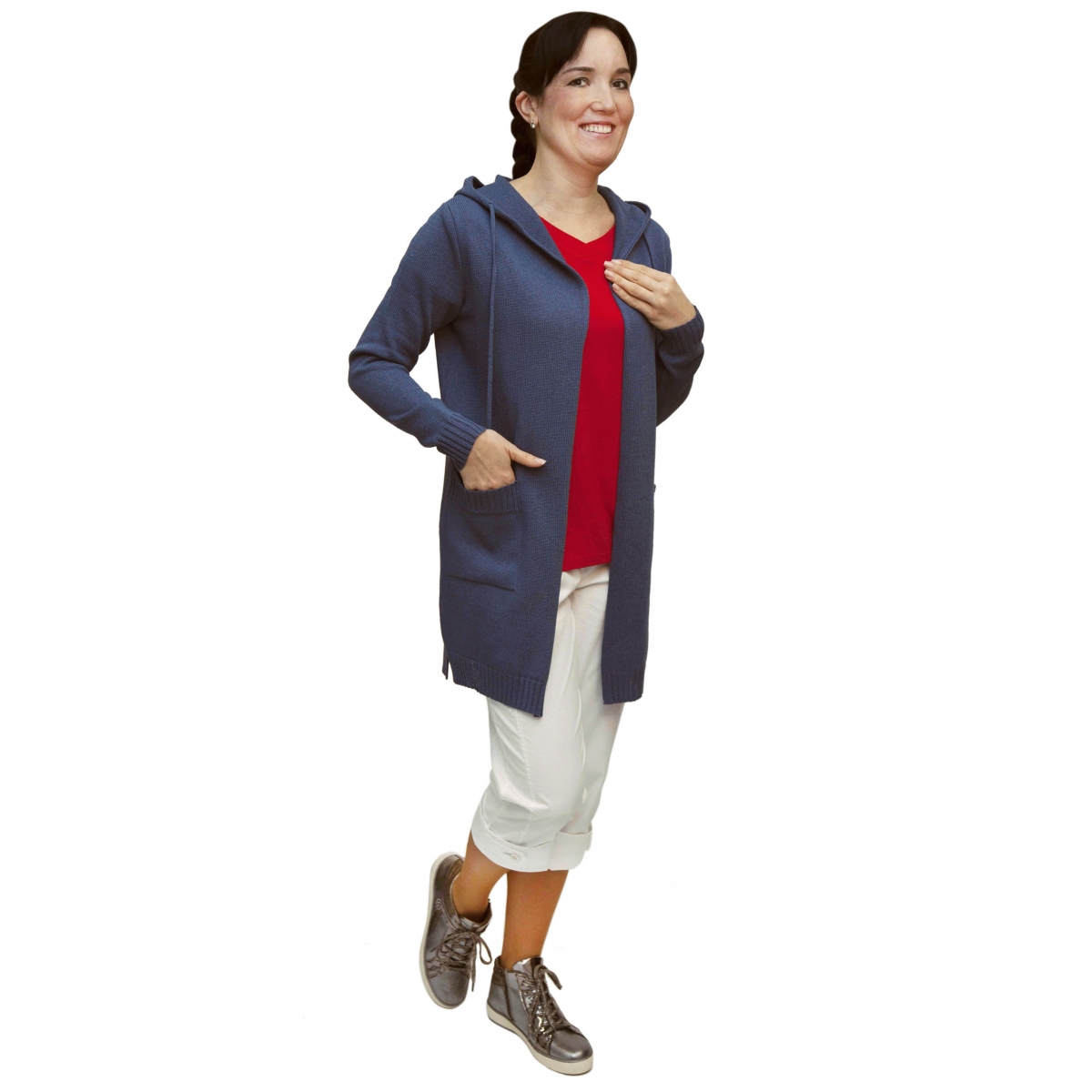 - dlouhý modrý kardigan s kapucou