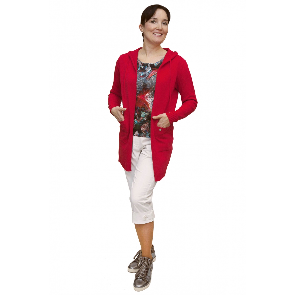 - dlouhý červený kardigan s kapucou