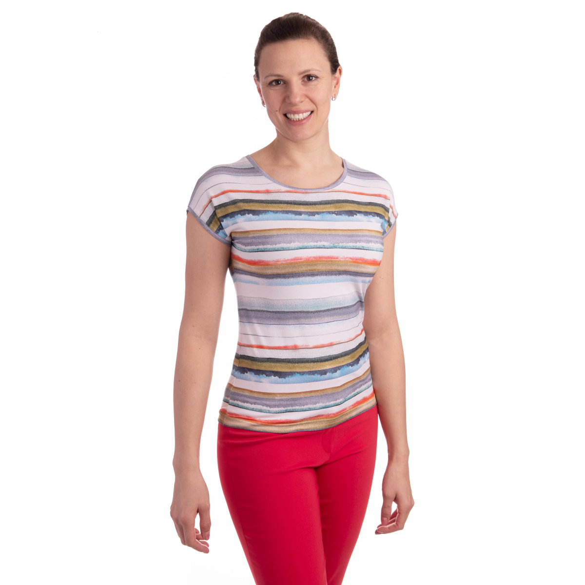 - tričko s krátkým rukávem a potiskem bílo-modro-oranžových proužků