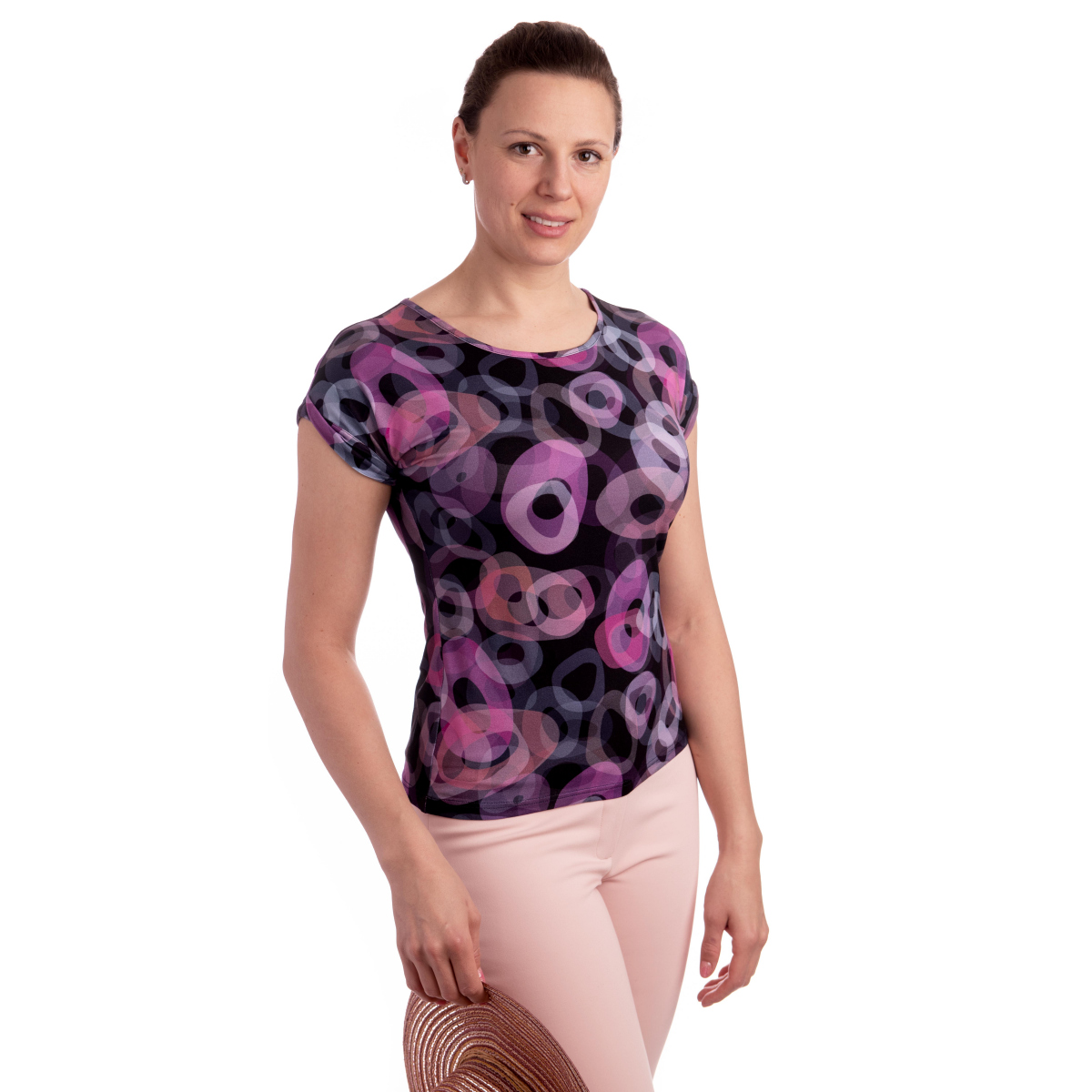 - nápadité tričko s barevnými kroužky ve fialových a šedých odstínech na černém podkladu