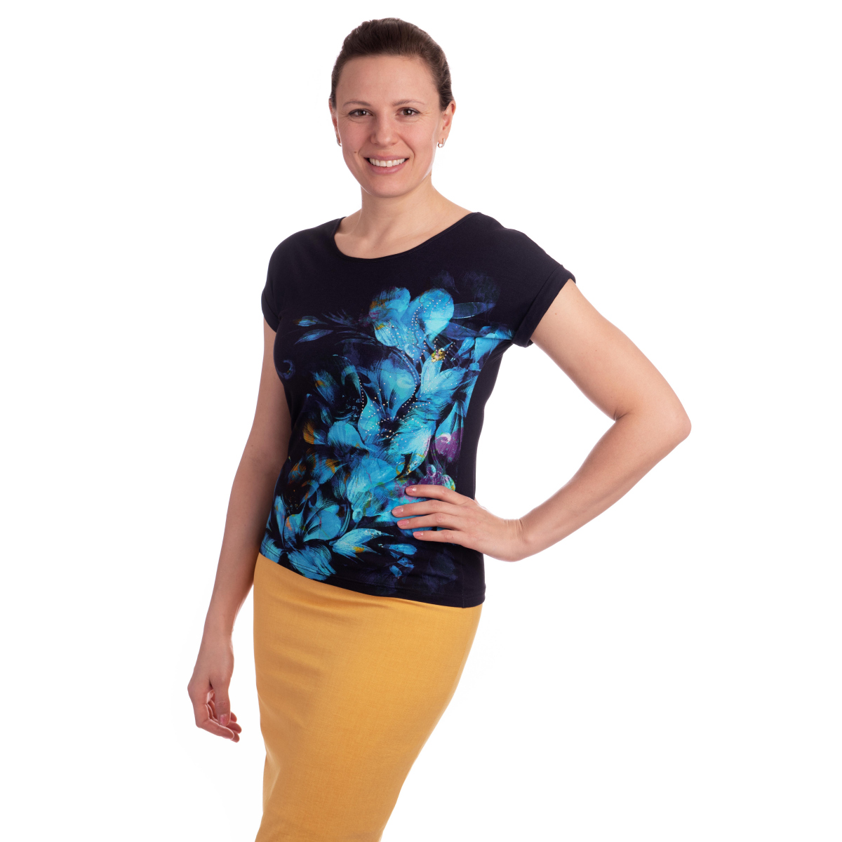 - tričko s pěknou barevnou kombinací světle modrých květů na tmavomodrém podkladu
