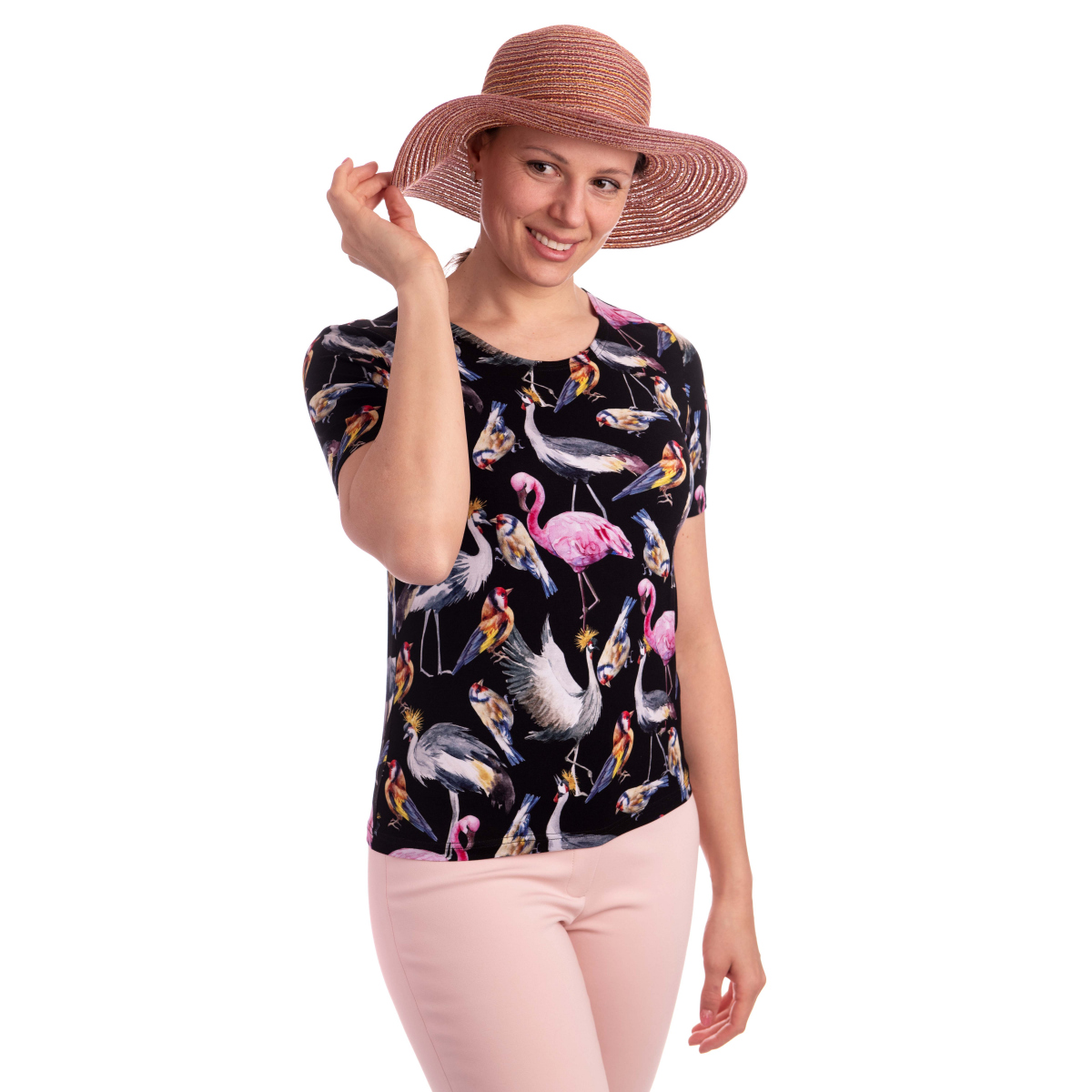 - tričko s obrázky barevných ptáčků na černém podkladu