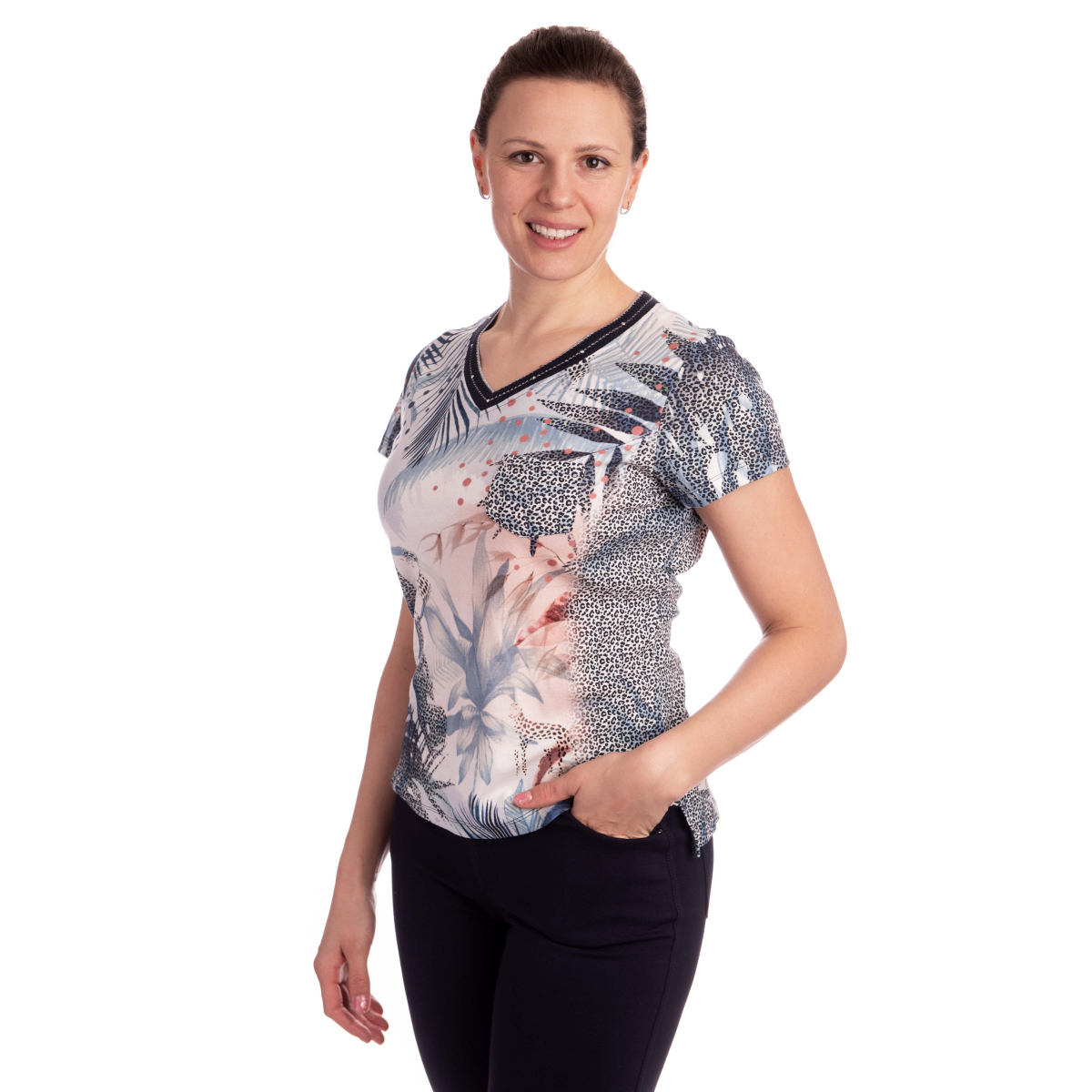 - tričko s modrorůžovým motivem orchidejí a palmových listů