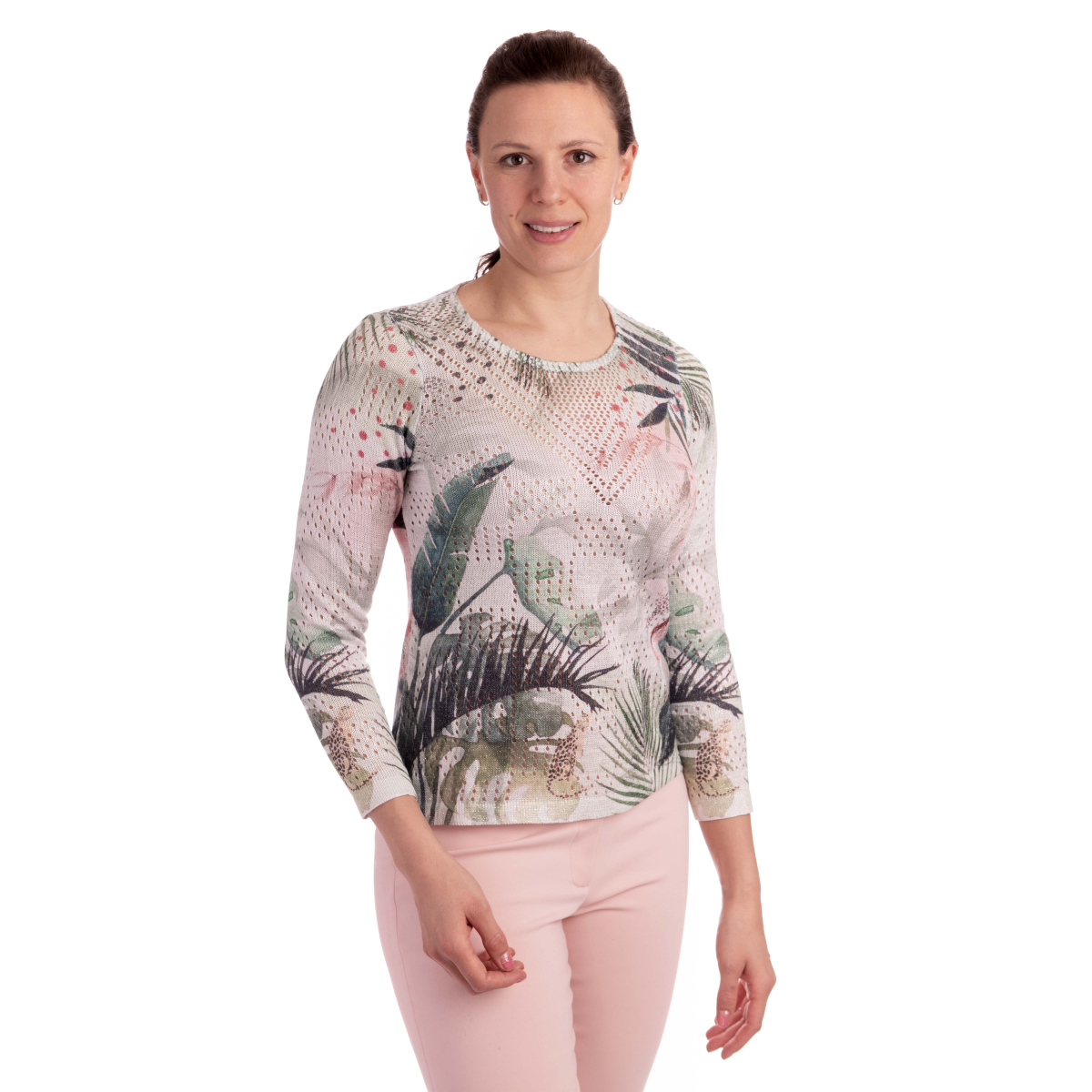 - perforovaná úpletová halenka s motivem palmových listů ozdobená lurexem