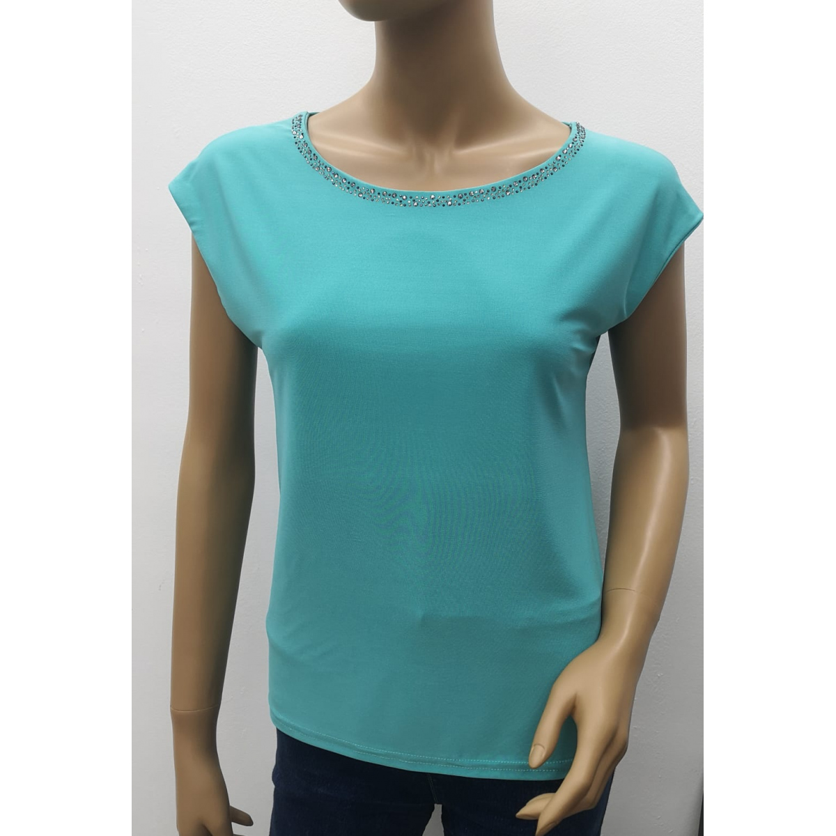 - elegantní jednobarevné tričko v zelené barvě s decentní aplikací kamínků okolo výstřihu