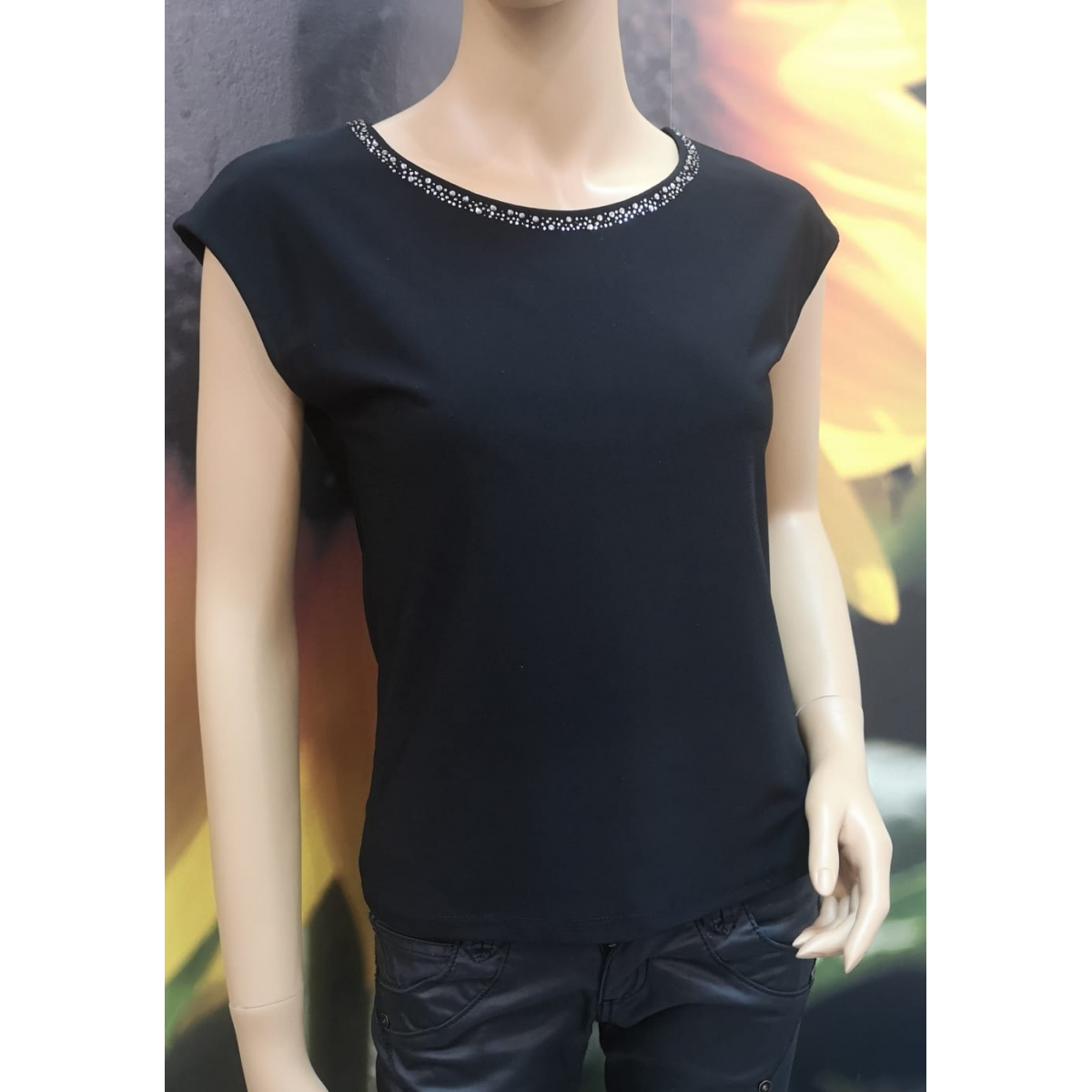 - elegantní jednobarevné tričko v černé barvě s decentní aplikací kamínků okolo výstřihu