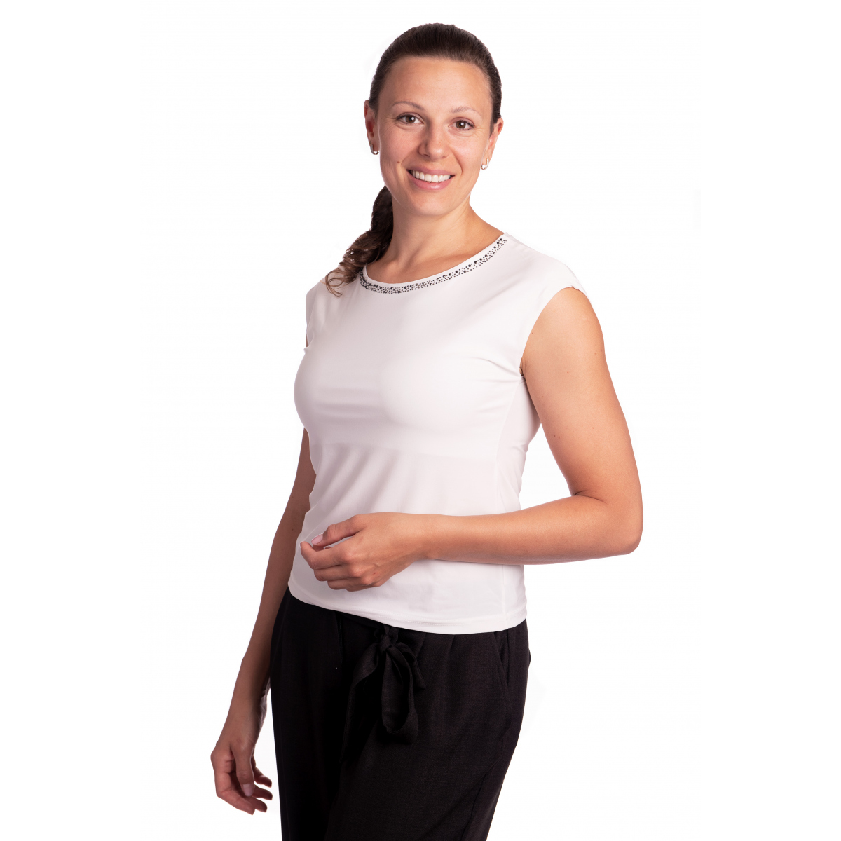 - elegantní jednobarevné tričko ve smetanové barvě s decentní aplikací kamínků okolo výstřihu