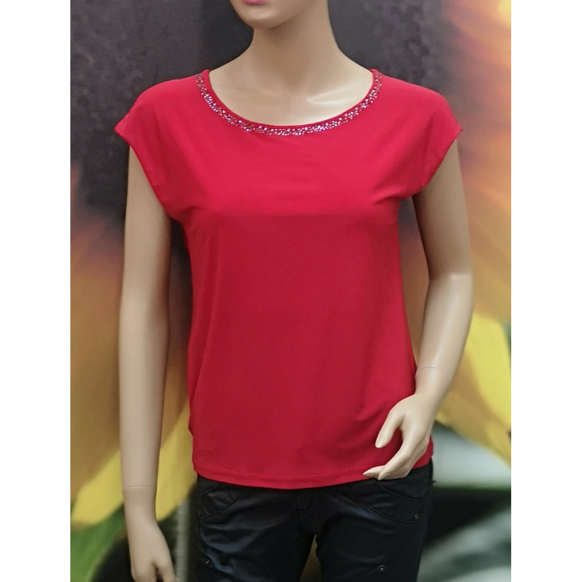 - elegantní jednobarevné tričko v červené barvě s decentní aplikací kamínků okolo výstřihu