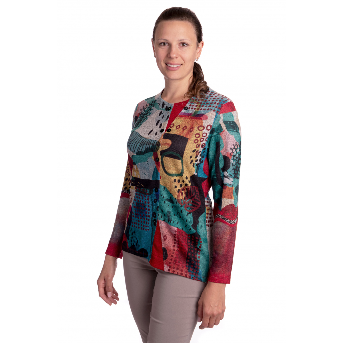 - halenka s barevným vzorem z měkkého, hřejivého úpletu