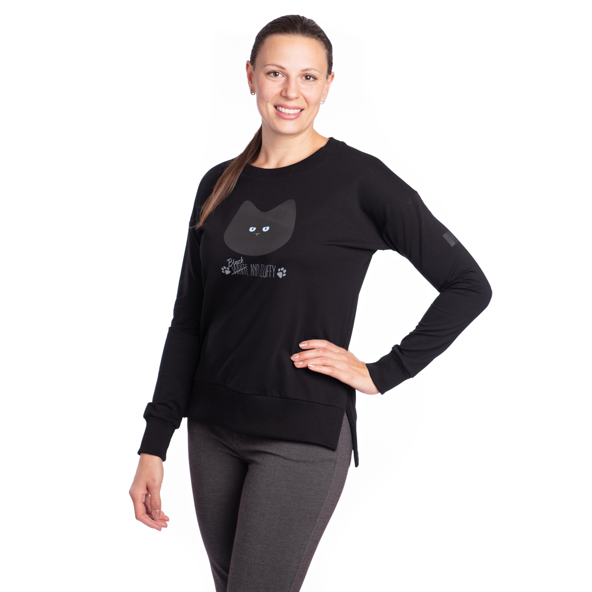 - černá mikina s veselým kočičím obličejem na přední i zadní části