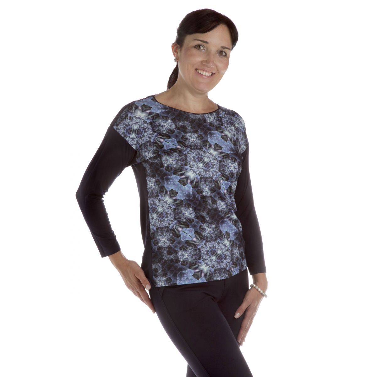 - tmavomodré tričko s modrozeleným "vodním" vzorem na přední části - dlouhý rukáv